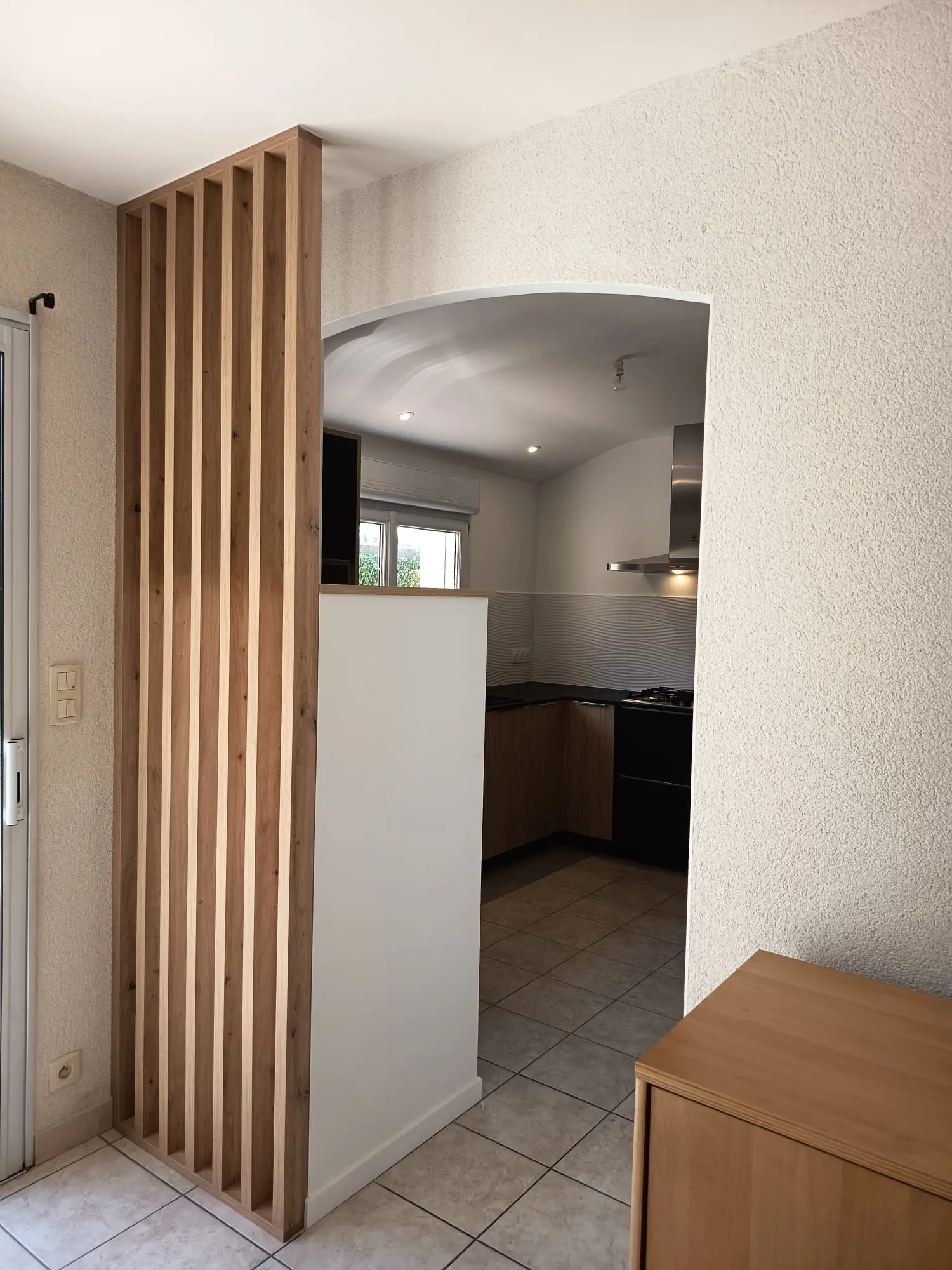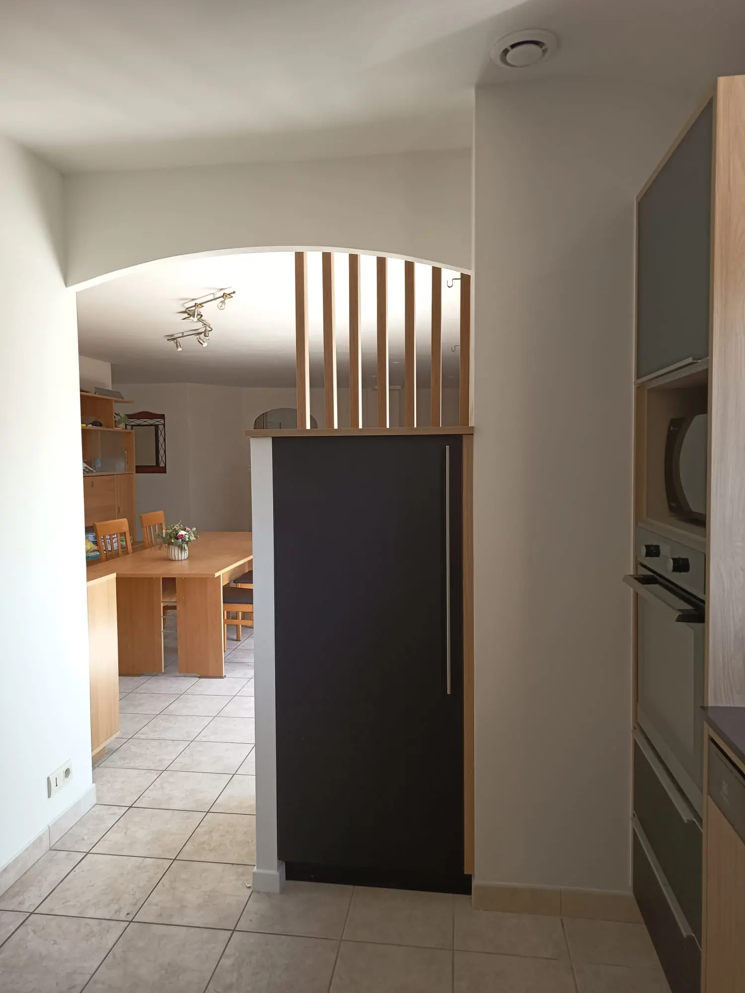Cette petite cuisine a tout d’une grande. L’espace est optimisé. Le claustra laisse passer la lumière et permet de bien marquer les espaces.