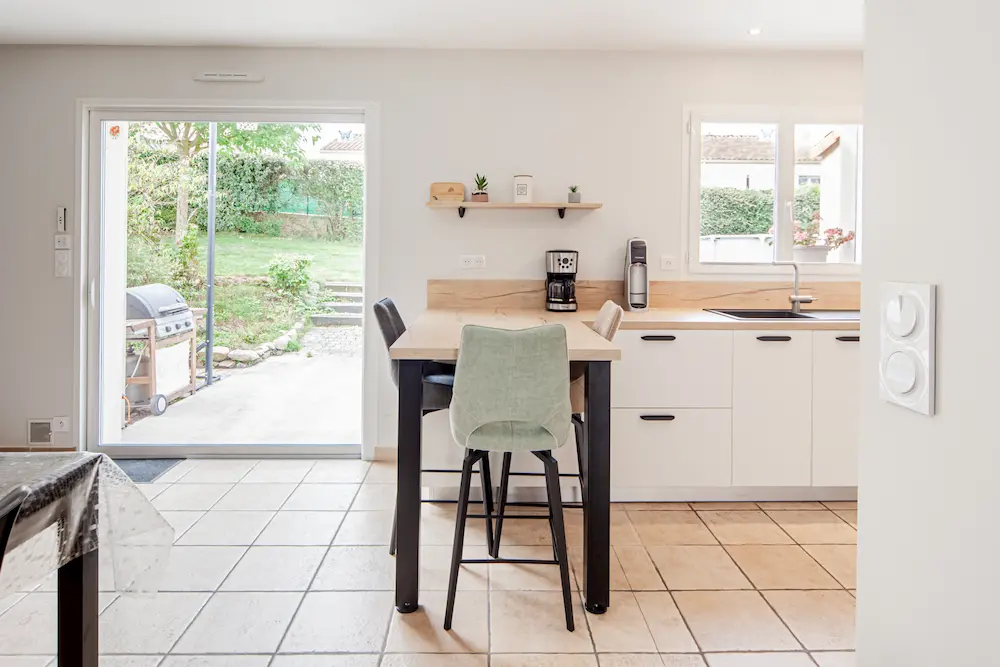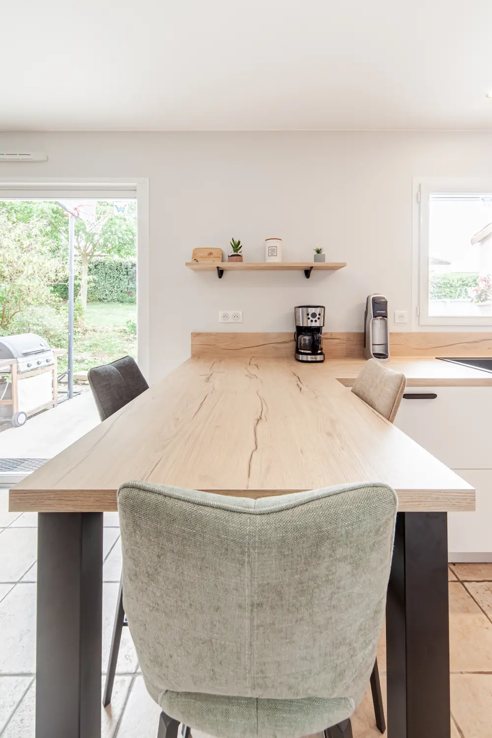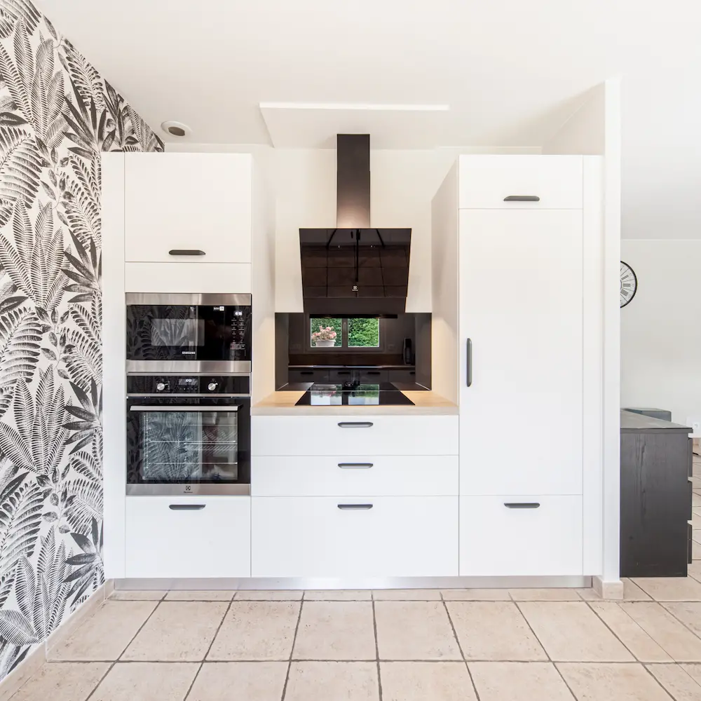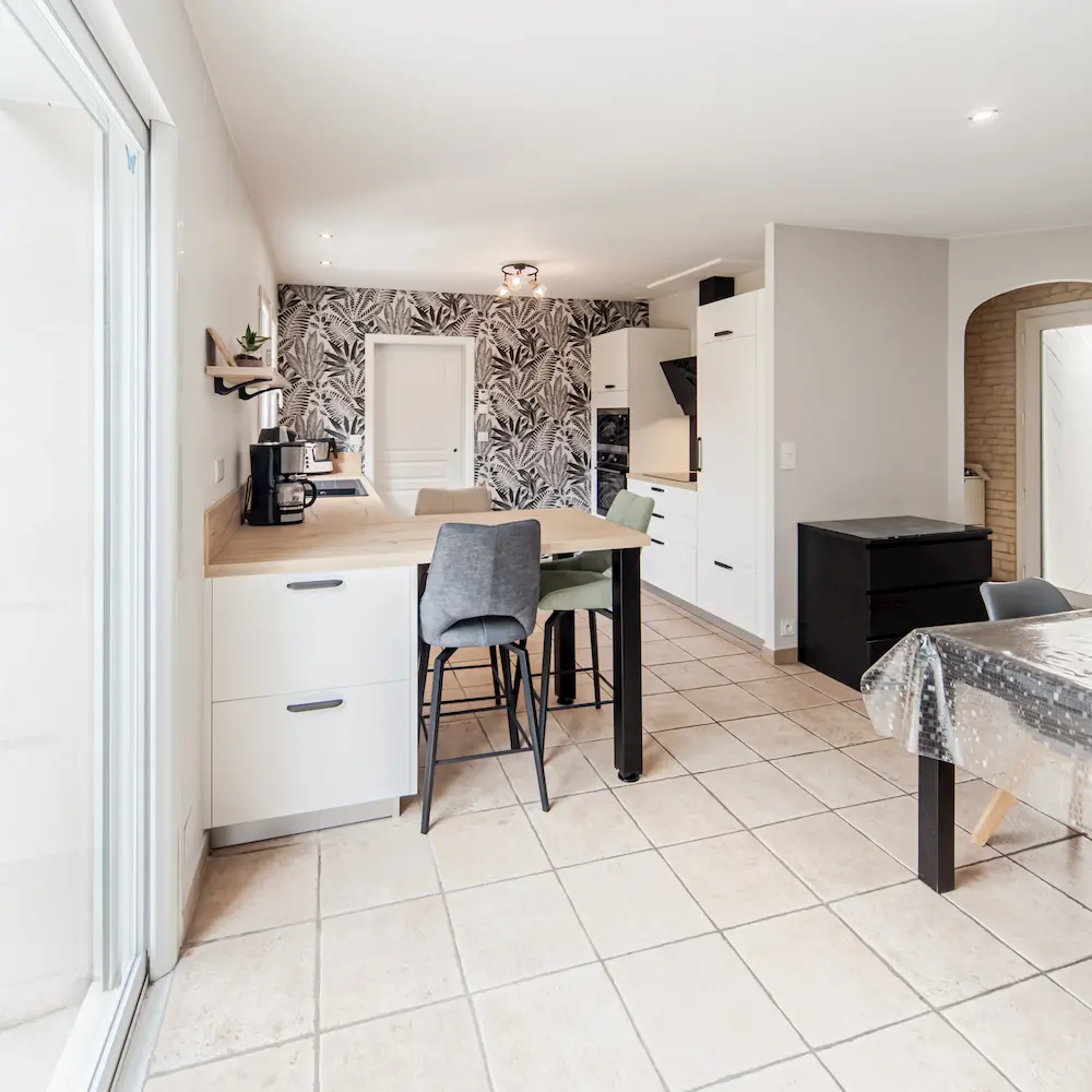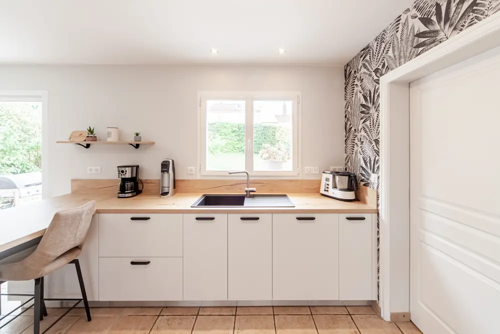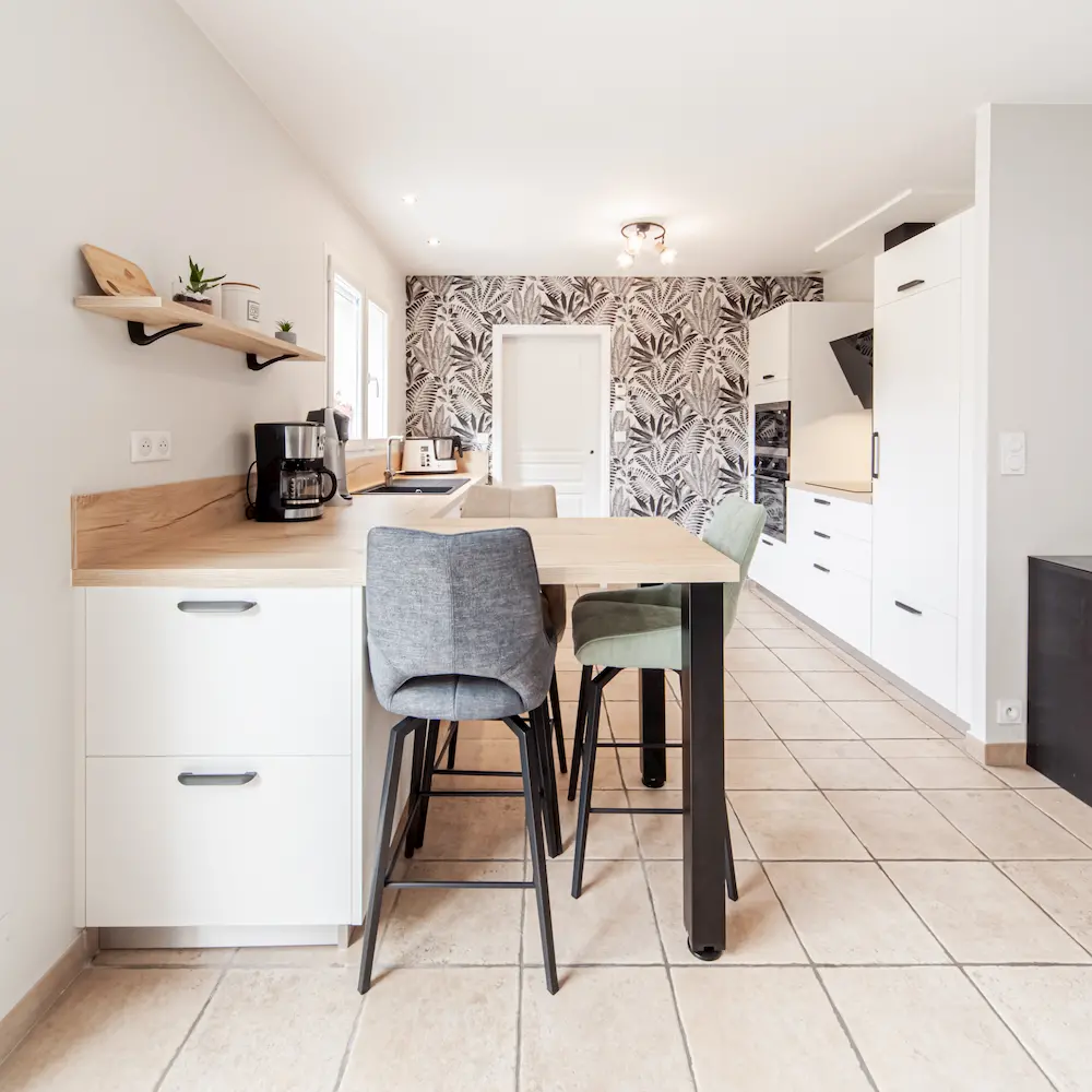 Une cuisine blanche relevée par un papier peint fleuri, des tabourets colorés et tout de suite la pause café prend tout son sens.