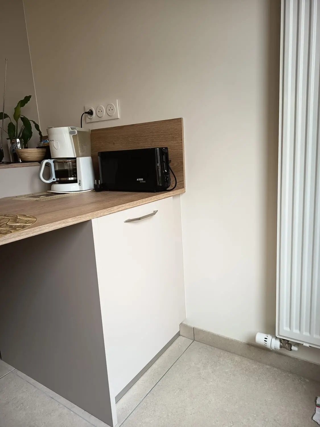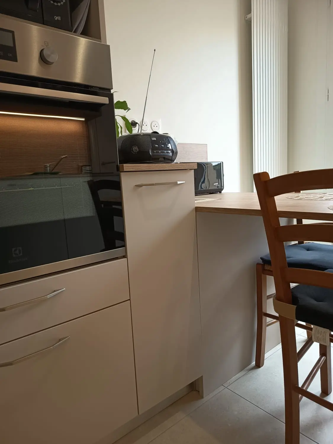 L’espace a été optimisé pour conserver un coin repas pour 2 adultes et un enfant. Les rangements sont accessibles.