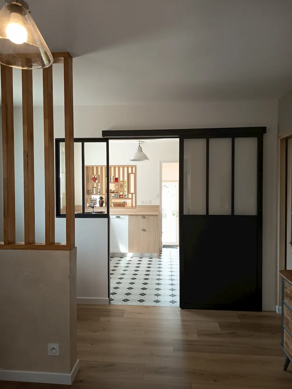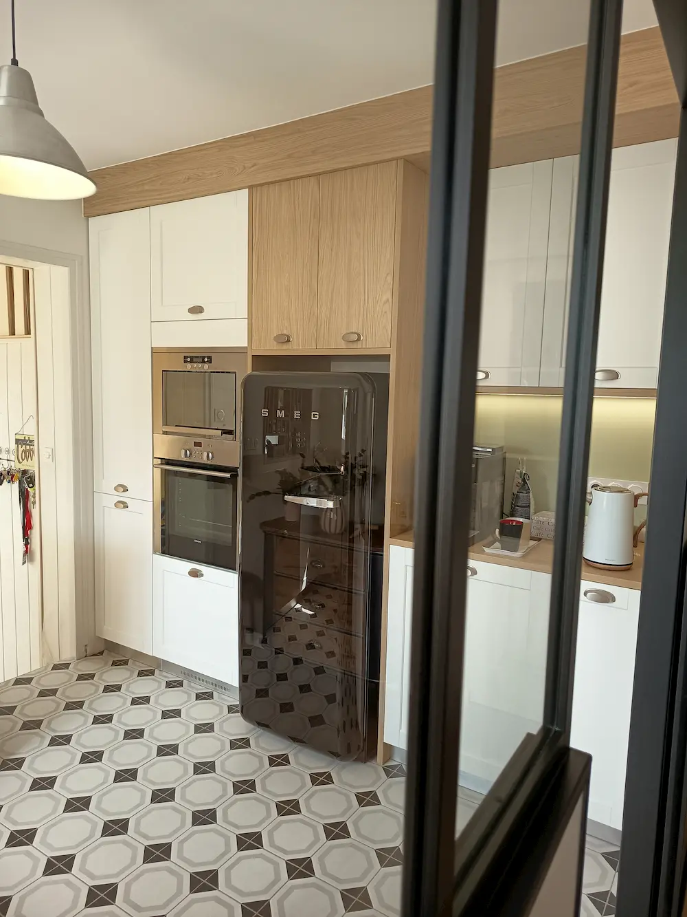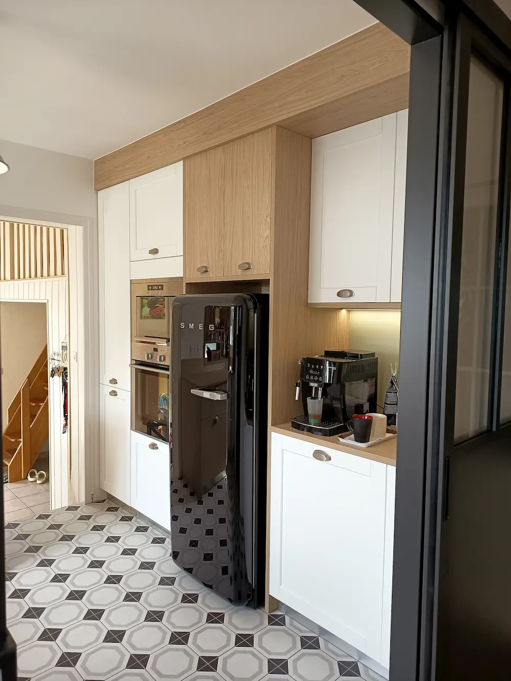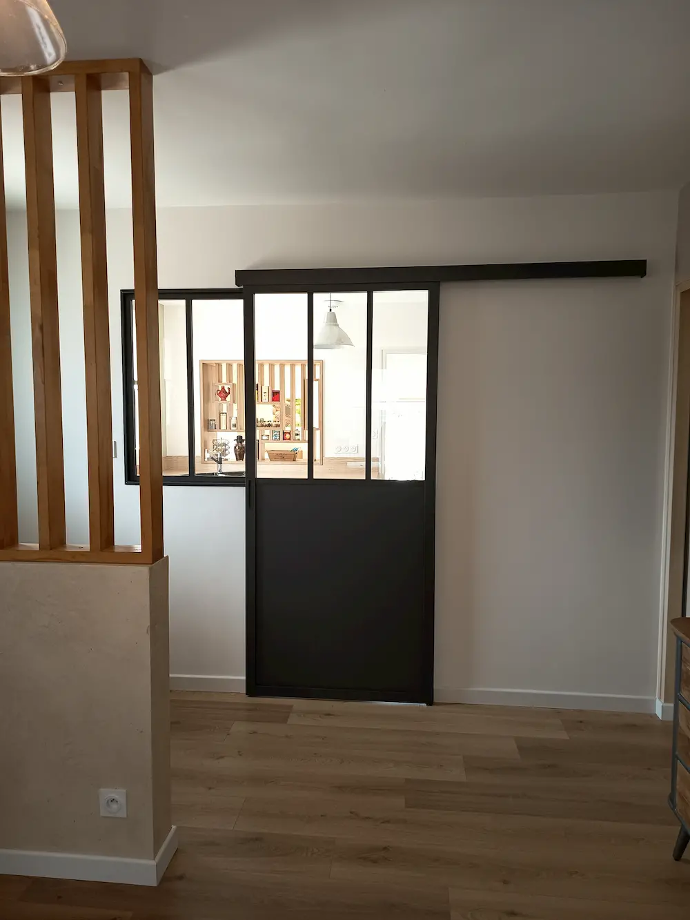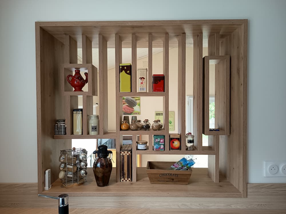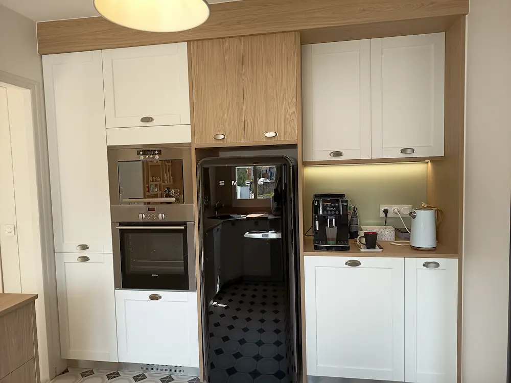 Cette cuisine est fonctionnelle et dispose d’un table amovible qui peut accueillir 2 personnes. La verrière bois est design et pratique.