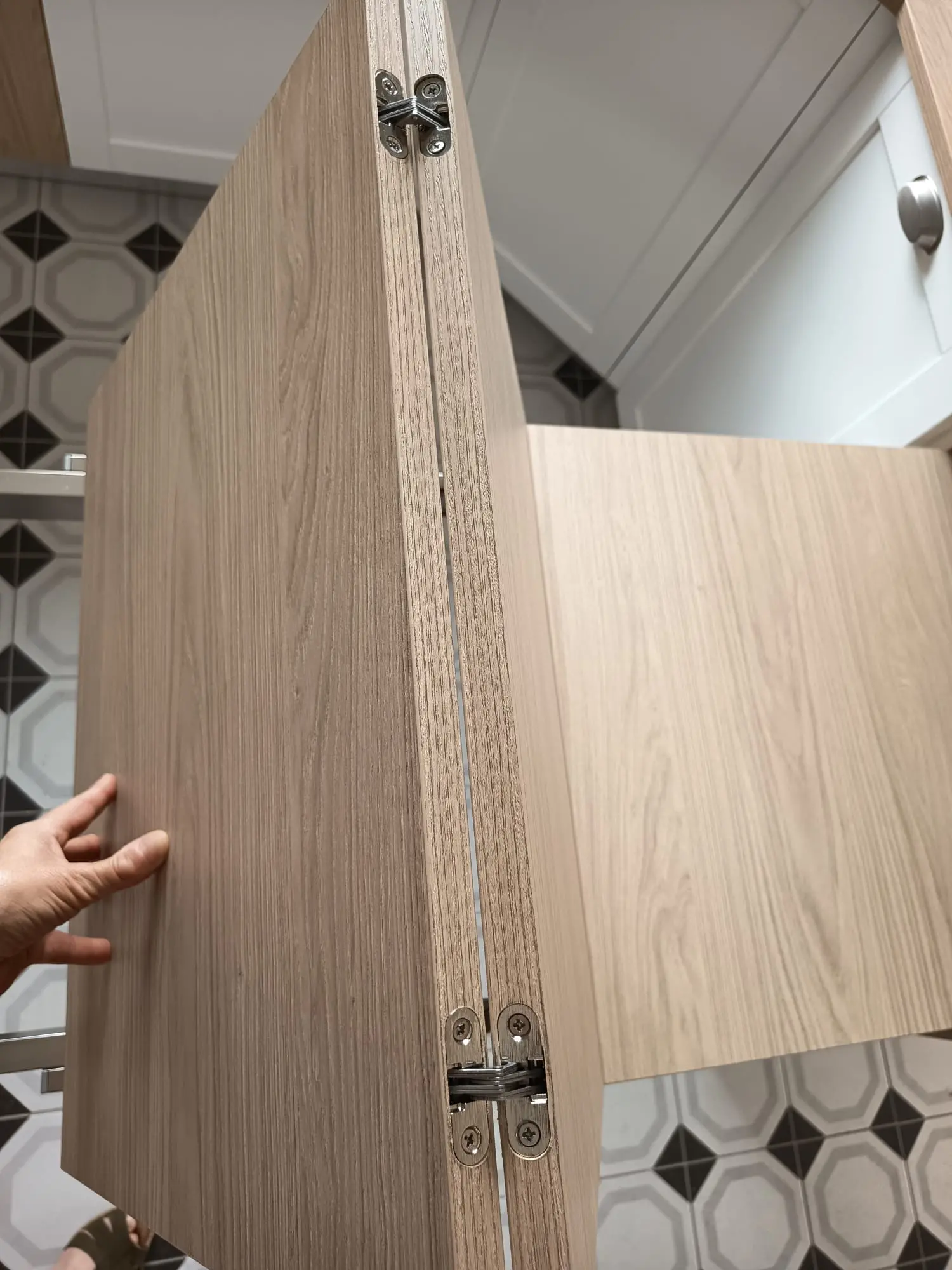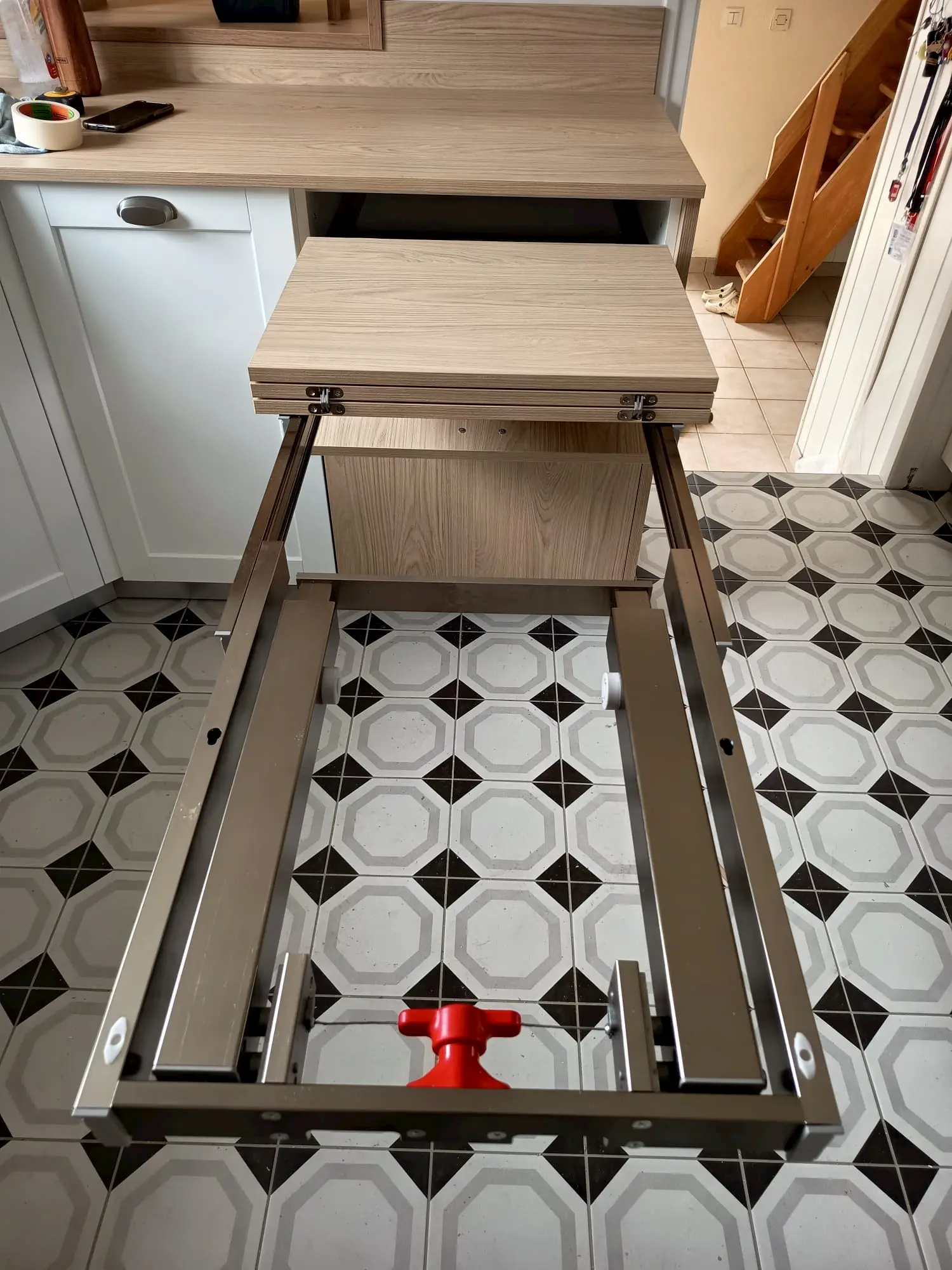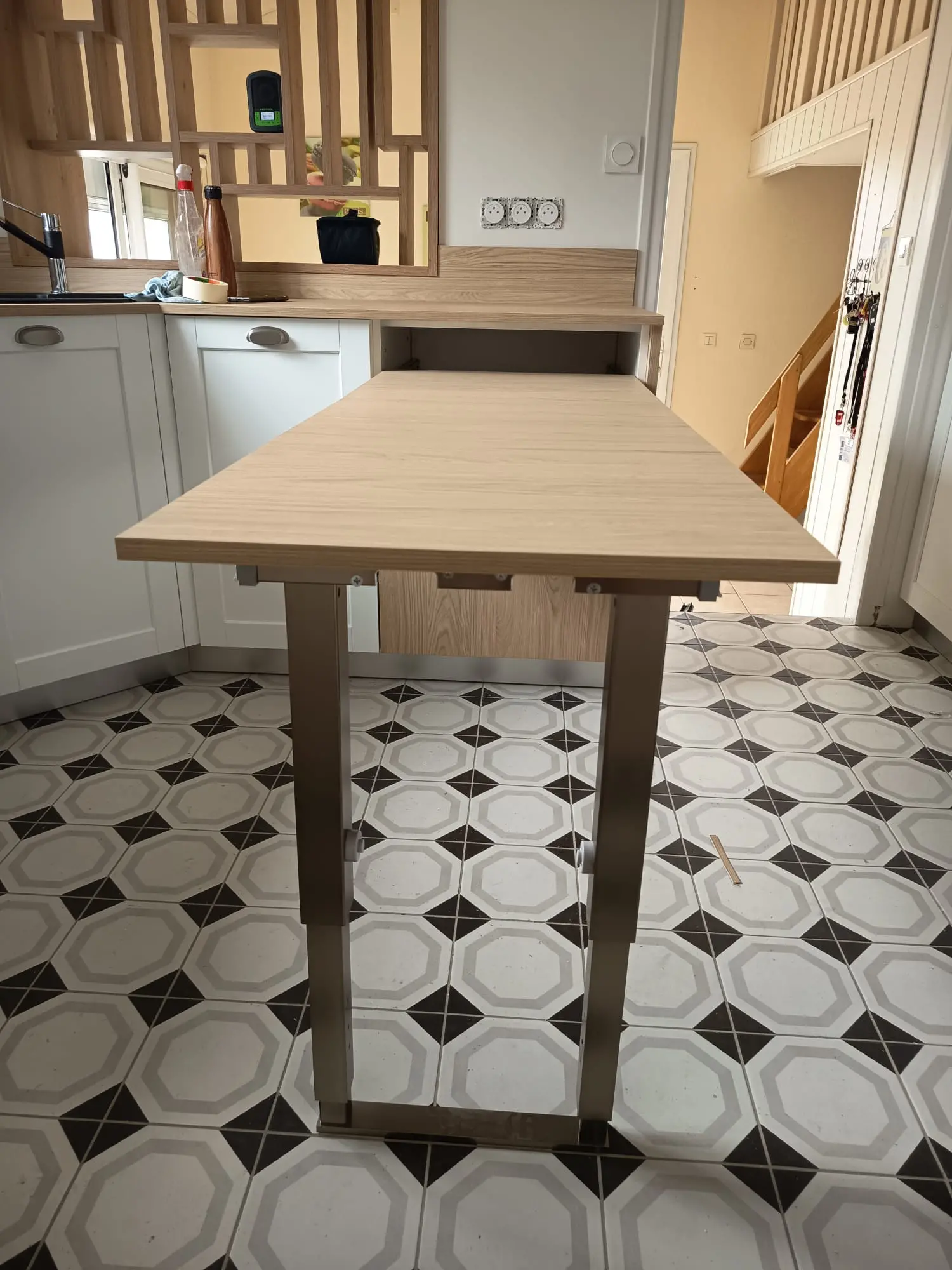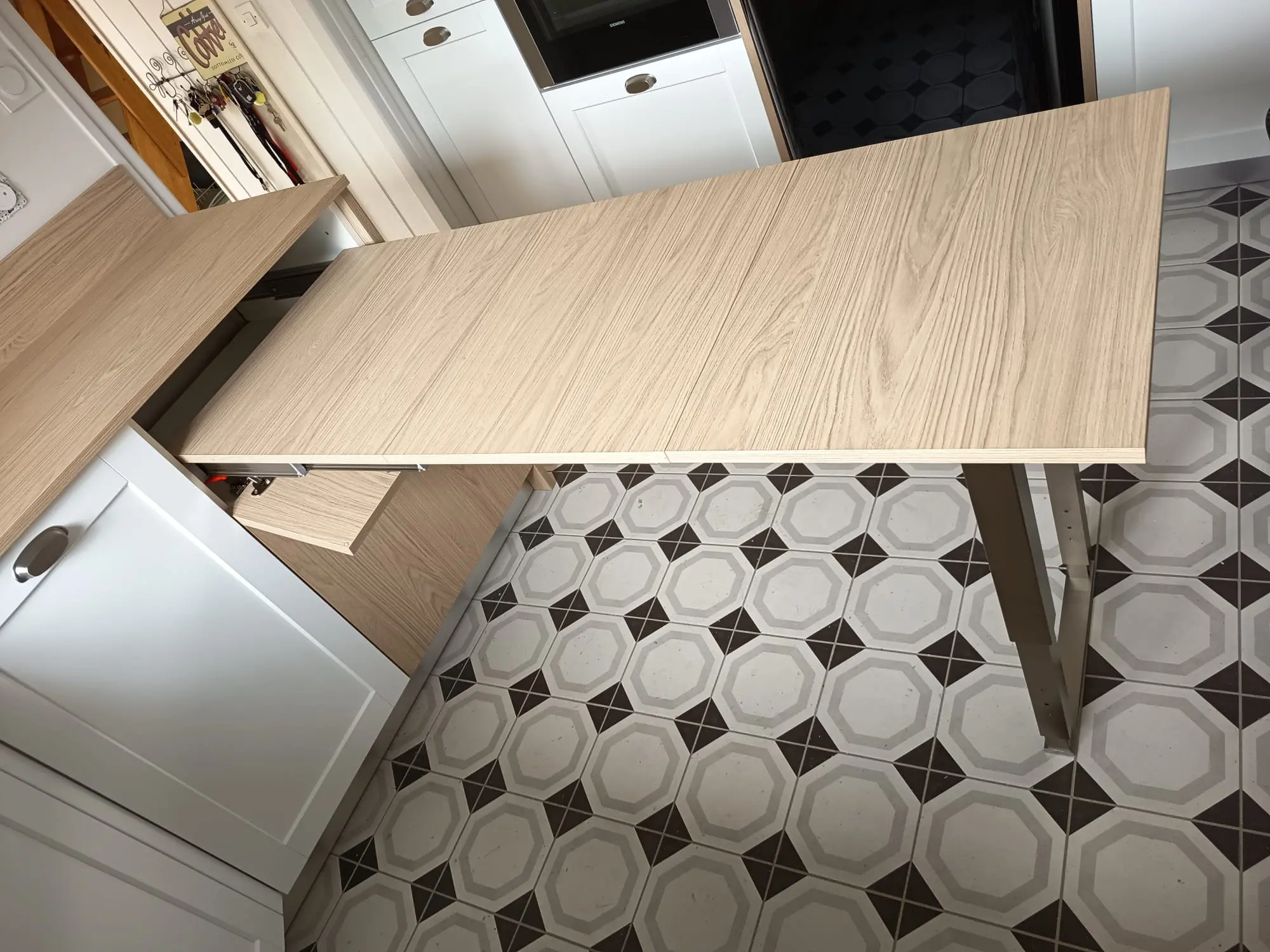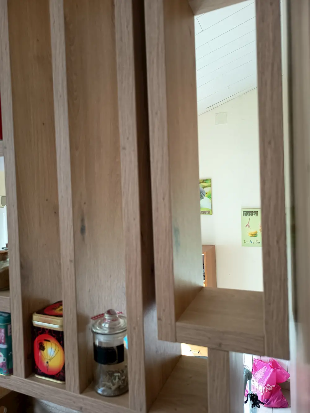 Cette cuisine est fonctionnelle et dispose d’un table amovible qui peut accueillir 2 personnes. La verrière bois est design et pratique.