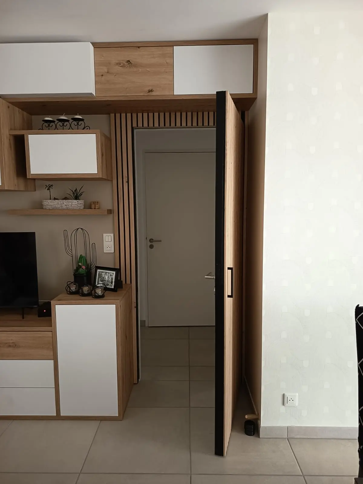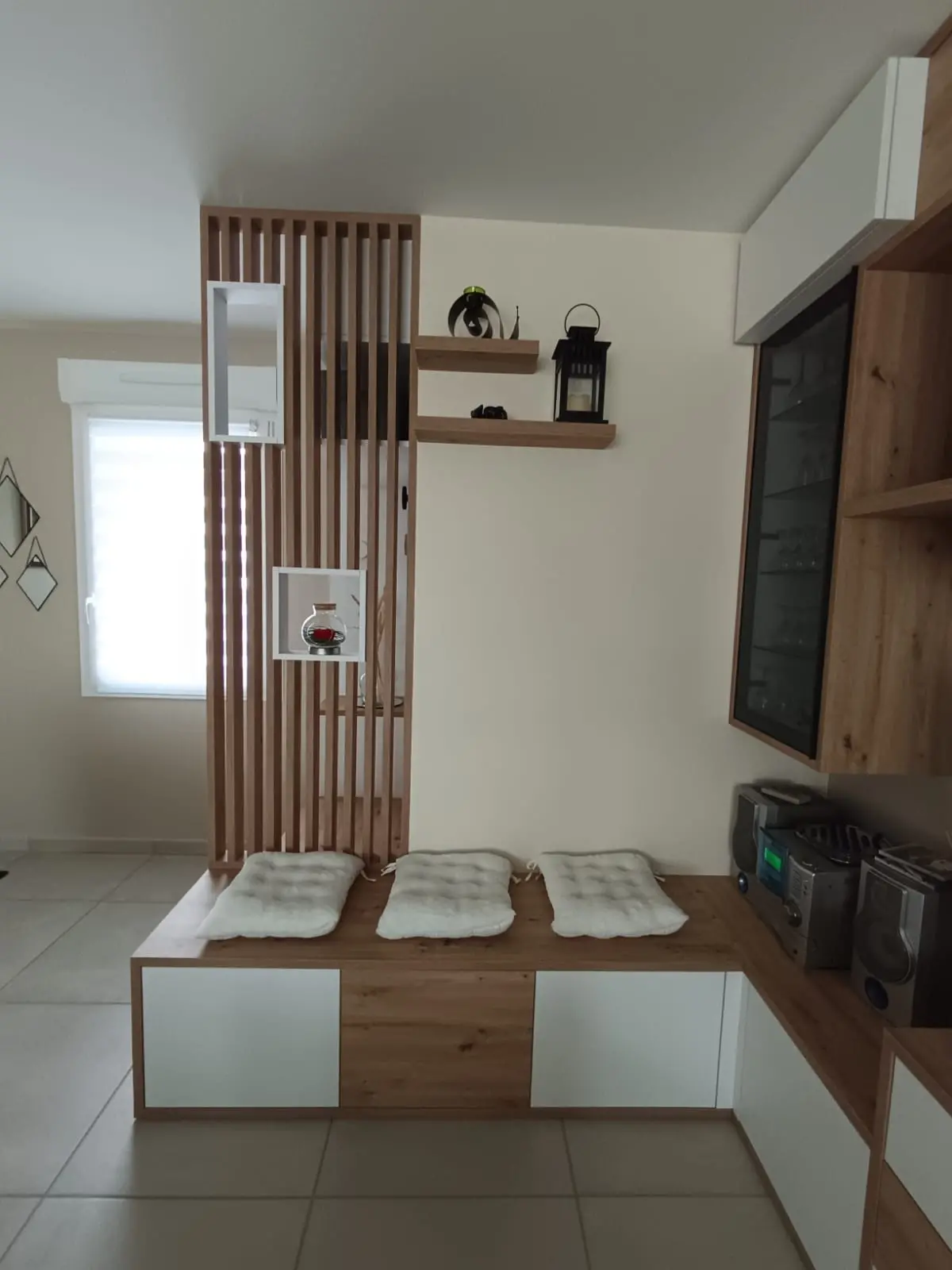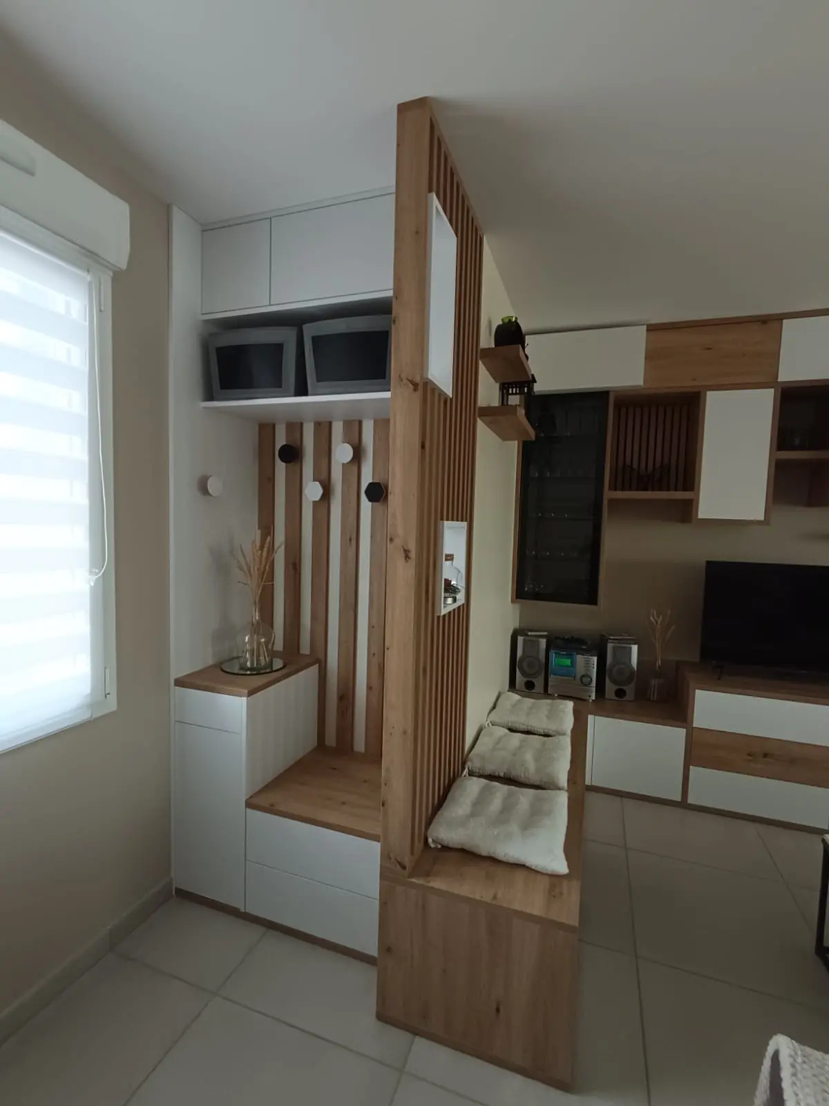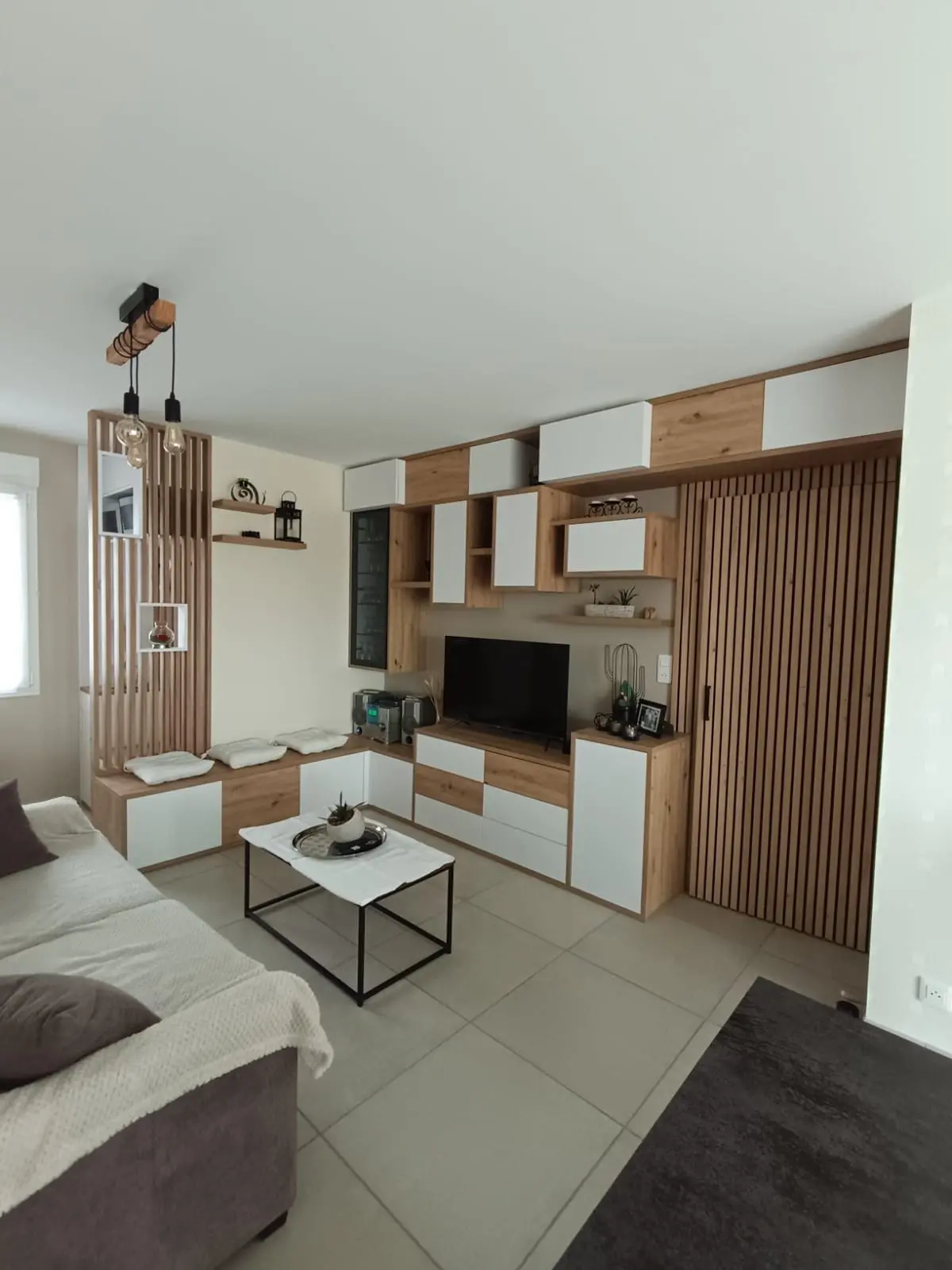 Un 3 en 1 dans cet espace : l’entrée est marqué et séparé de la pièce de vie par un claustra. Le salon se veut accueillant et ouvert sur le meuble Télé.