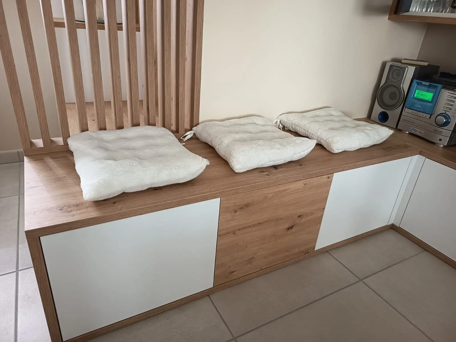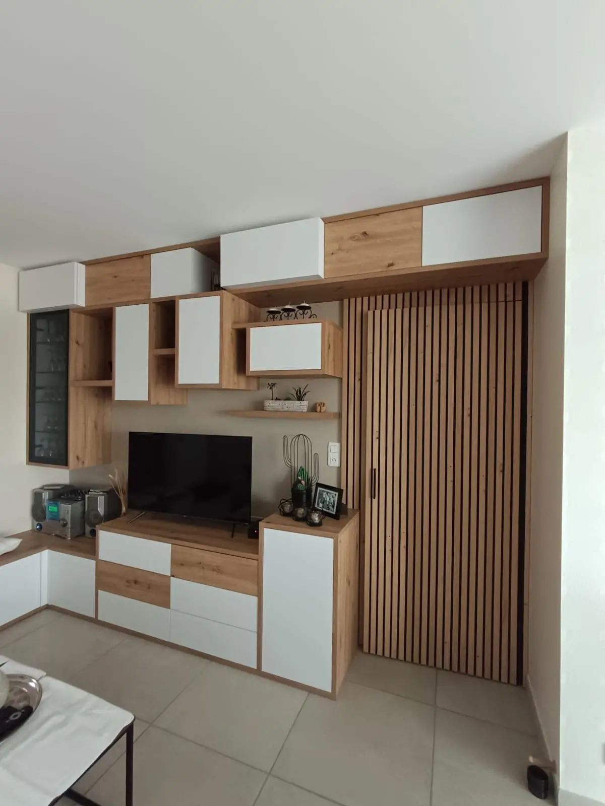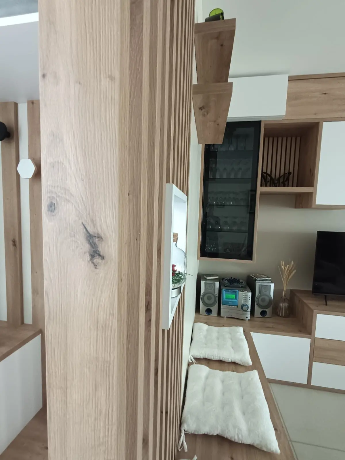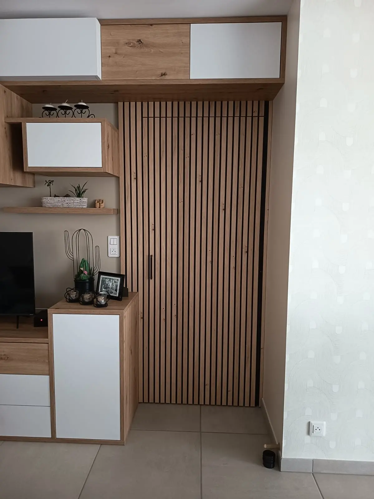 Un 3 en 1 dans cet espace : l’entrée est marqué et séparé de la pièce de vie par un claustra. Le salon se veut accueillant et ouvert sur le meuble Télé.