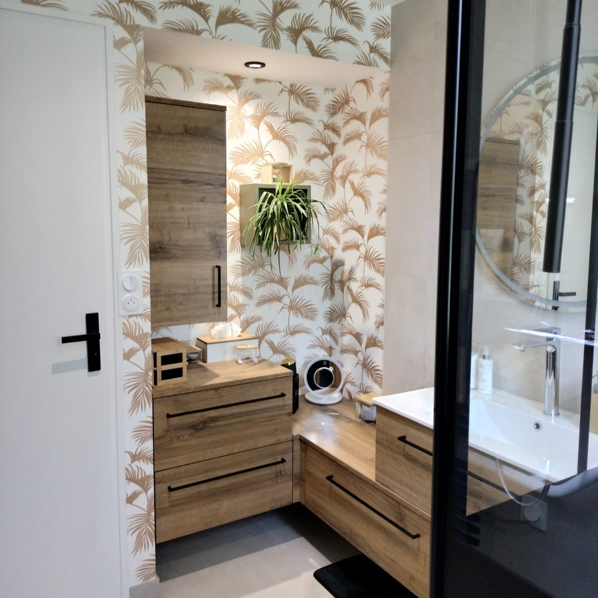 Aménagement d’une salle de bain dans une ambiance naturelle avec des teintes douces et chaleureuses.